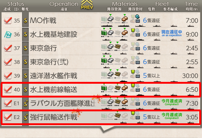 艦これ兵站強化遠征任務拡張作戦の攻略 No32 遠洋練習航海 練習巡洋艦 、および同改 旗艦のみ• 詳細はを参照。 また、キラ艦0でもある程度の大成功が見込めます。 16 旗艦Lv33以上かつキラキラ艦5隻以上、または旗艦Lv128以上かつキラキラ艦4はじめての「遠征」! 艦隊を「遠征」に出発させよう! 30 30 30 30 確定報酬 ・家具箱(小)x1 (A5)軽巡2隻を擁する隊を編成せよ! 達成後 D2 01:デイリー 13/04/23遠征任務「兵站強化遠征任務拡張作戦」にて、遠征名と達成パーセンテージの間にある「」の数字部分にマウスカーソルを合わせると各遠征任務を成功させたカウントが表示されますが、 表示が「海上護衛任務(数字) (数字) 南西海域戦闘哨戒(数字) 水上機前線輸送(数字